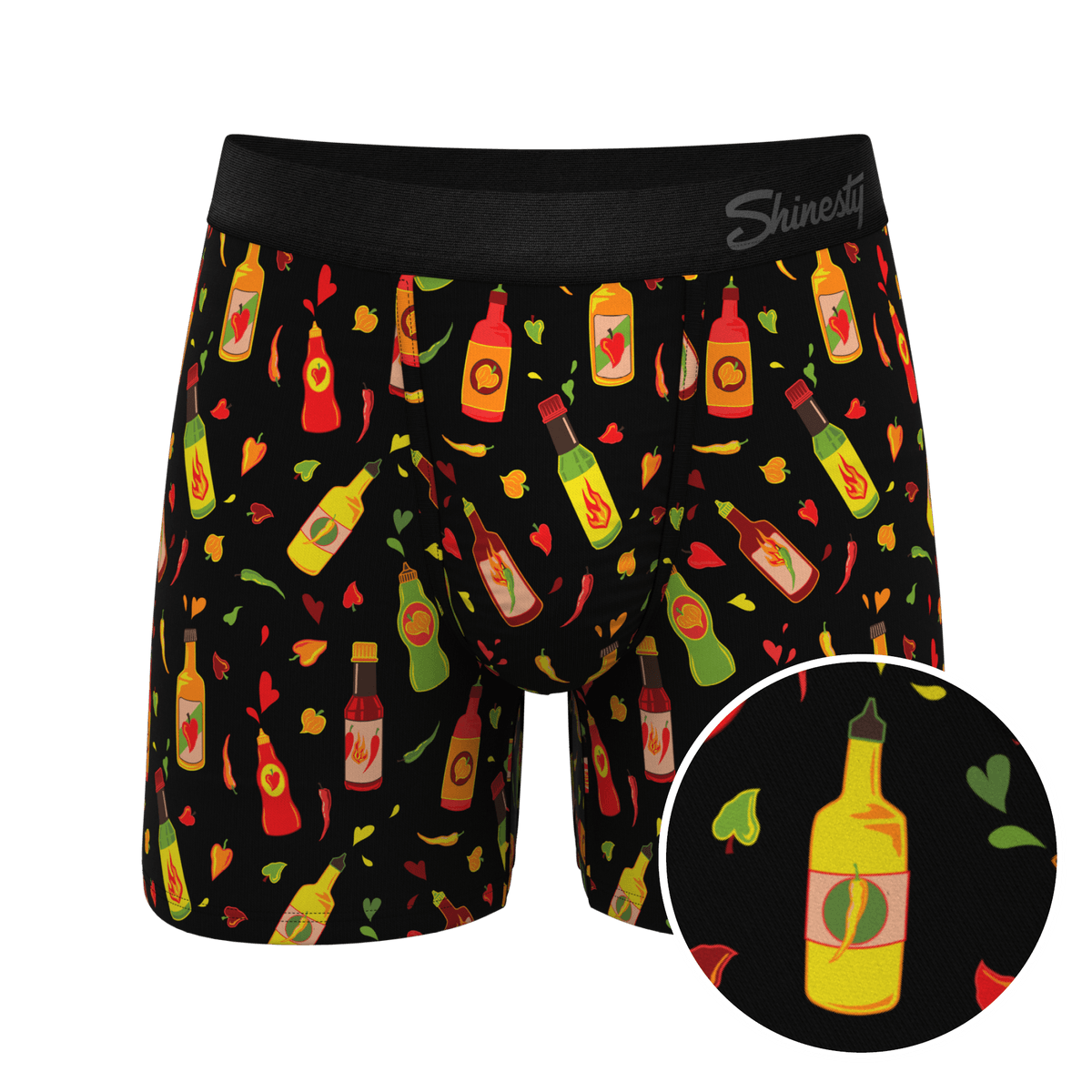 Premium wholesale hot sauce print boxer briefs featuring Ball Hammock pouch technology.